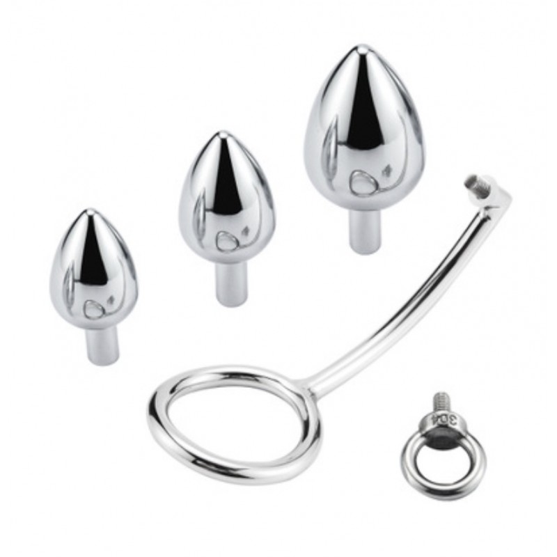 Anal clamp with 3 attachments Metal Anal Toys is an erotic accessory designed to explore new sensations in the intimate area. It has a convenient shape and a special fixation system that allows you to securely hold the plug inside the anus.