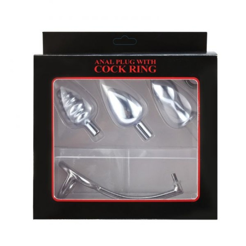 This clamp consists of several parts: a plug for anal insertion, a cuff for fixing the scrotum and three attachments of various sizes. All elements are made of high-quality medical steel, body-safe and hypoallergenic.