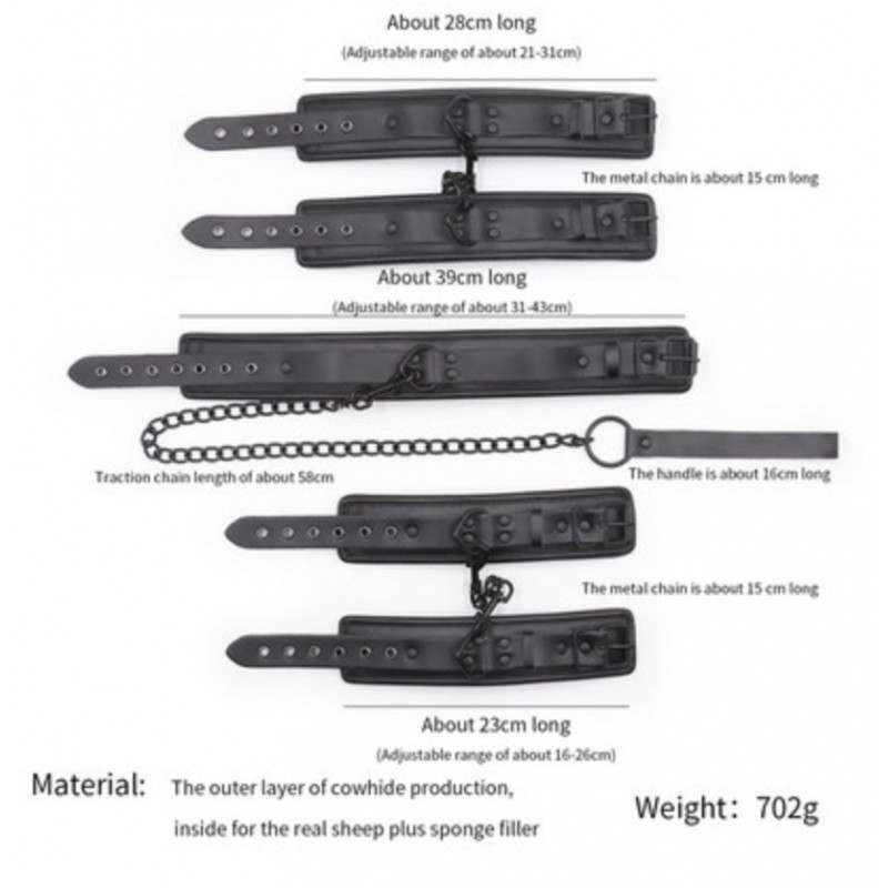 This set consists of a collar, on which a lace is conveniently attached, durable handcuffs on a soft lining, and leg cuffs on a beautiful black chain. All these items can be used both separately and as a set, creating various combinations for the pleasure of your partner.