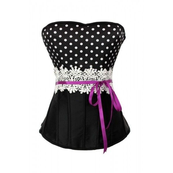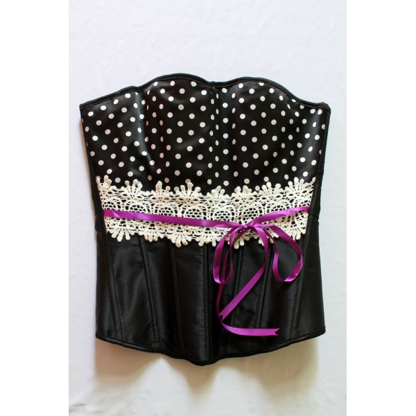 Original polka dot corset is decorated with a band of white lace and a delicate purple ribbon. A corset provides great support for your chest and waist a shape as it should be. The kit contains g-string. |