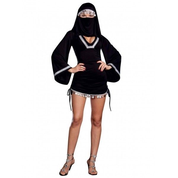 Carnival costume a Turkish Princess black with silver trim. Costume includes a mini dress with long, wide sleeves and a cutout at the neckline and the headpiece. Will give you the sexuality and uniqueness. |