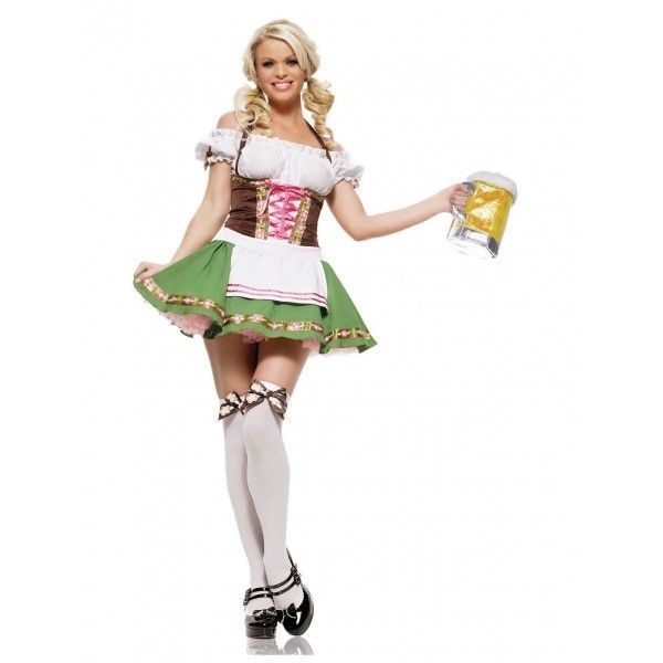 Carnival costume, Bavarian waitress green color with lace decor, stylish pattern, featuring a pinching in the center. The costume consists of mini dress with short lace sleeves, full skirt and a cute apron. The costume also includes a G-string and bows fo |