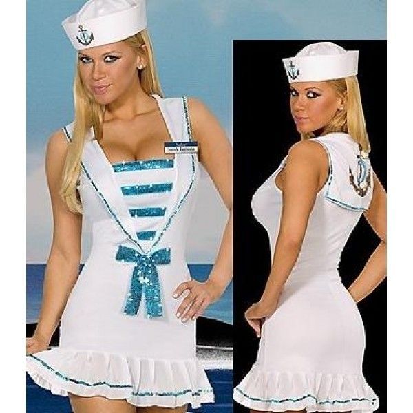 Carnival costume white color consists of : mini dress with open cleavage on broad straps with blue decor and blue bow in the center and sailor caps. A great choice for role-playing games. |