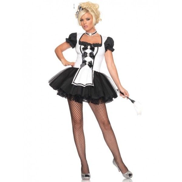 Erotic fancy dress maid costume includes black and white dress with puffy podobnikar, apron and necklace. The product is decorated with satin bows. |