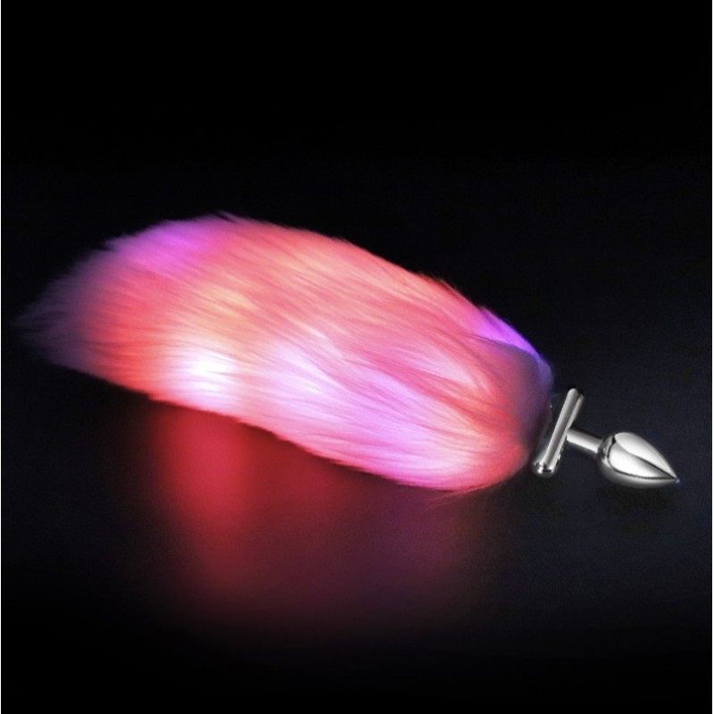 Smooth metal plug with fluffy and bendable tail. Nickle-free. 3-frequency built-in lights. Remove or insert the tab inside the on/off to control. Alternative extra metal base included. |