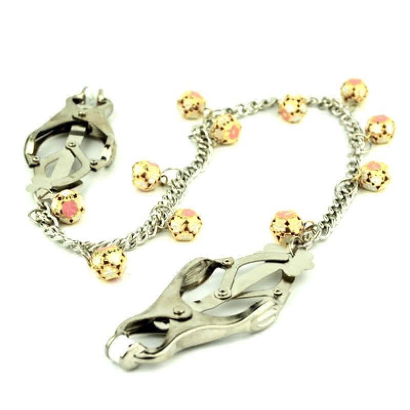 Nipple Clamps Chain with Gold Beads is a stylish and sophisticated accessory designed for those who value a sophisticated combination of aesthetics and functionality. These clamps are made in an elegant silver color, which makes them universal and suitable for any look. The main material from which the clamps are made is medical steel, known for its hypoallergenicity and durability. This material ensures safety and comfort during use, which is especially important for sensitive areas of the body.