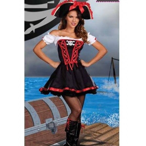 Erotic costume pirates of black color consists of : mini dress with red details and wet with short white sleeves and the bone pattern in the center, pirates hat and black tights. |