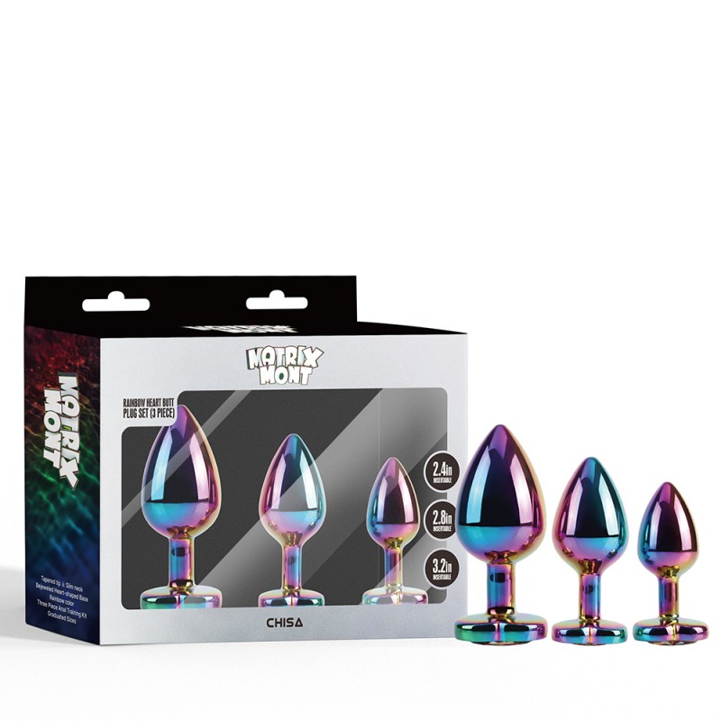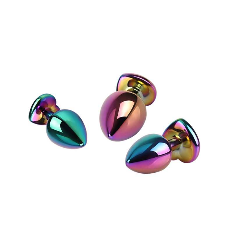 The Rainbow Heart Butt Plug Set includes three exquisitely designed plugs, each made from high-quality aluminum alloy and ABS plastic. This set is perfect for both beginners and more experienced users looking to explore new dimensions of pleasure. The plugs come in various sizes, allowing for varied sensations and adapting to personal preferences.