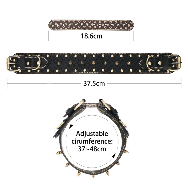 Designed for style and versatility, this collar features a dual-adjustment system: the brown strap offers buckle-hole sizing, while the black band with double buckles allows for easy length customization. The circumference adjusts from 14.6 to 18.9 inches. Dual D-rings provide convenient attachment points for detachable chains or leashes. Perfect for daily wear, this collar combines both style and practicality. Embrace daring individuality. Combining rugged metallic accents, premium materials, and tailored adjustability, the Vintage Spike Collar is designed to define your look with bold confidence.