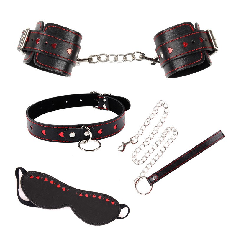 A set of BDSM accessories Red Heart Bondage Kit 3 Pieces is everything you need for passionate and vibrant games in bed. The set includes handcuffs, a collar with a leash and an eye mask, made of durable and pleasant to the touch polyurethane. Their black color and heart shape represent passion, strength and love for sexual adventure.