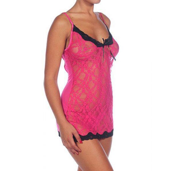 You will be more sexy in this rose babydoll. Spaghetti strap, backless with cross string. Black lace trim cups with satin bow tie in front. Black lace hem. Applique in front with mesh back. |