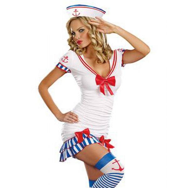 A white stretch knit mini dress with short cap sleeves, red ribbon trimmed V-shaped neckline with attached sailor collar, ruched bodice detail, striped layered ruffle inset back panels and matching hemline, removable/adjustable garter straps and red ribbon bow accents |