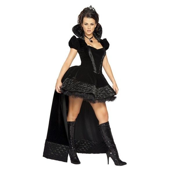 Sexy evil Queen costume consists of a gorgeous mini dress with a corset and long train and attached collar. |