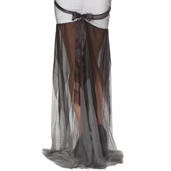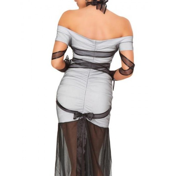 This halloween costume features pliacted tube mini dress joint black mesh. Unique sleeve design, off shoulder, black mesh band surround the dress and arms, tie up in the wrist and back. |