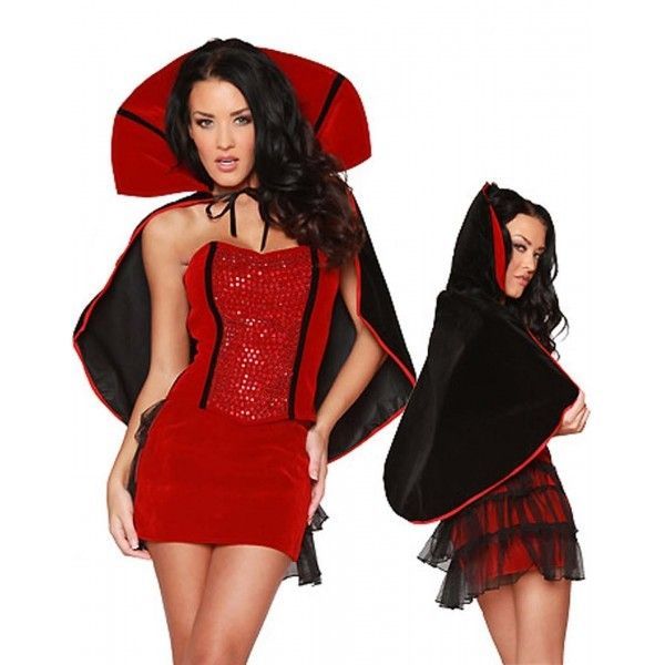 Three Piece Sexy Vampire halloween Costumes includes high Collar Cape, Rhinestone Studded Strapless Corset, and Mini Skirt with Ruffle Back. |