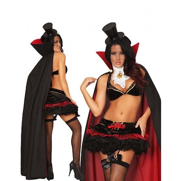 Three Piece Sexy Vampire halloween Costumes includes high Collar Cape, Rhinestone Studded Strapless Corset, and Mini Skirt with Ruffle Back. |