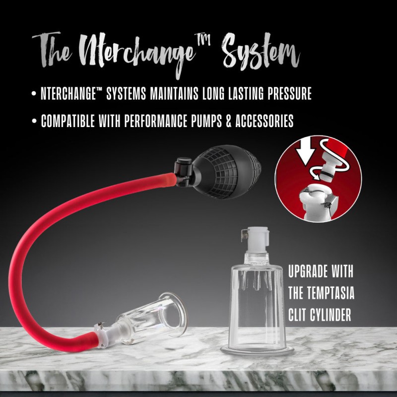 Nterchange System Compatible. Perfomance & Temptasia Pumps & Accessories In Our. Nterchange Systems are Compatible. Detachable Silicone Hose & Acrylic Cylinder. Increase Sensation To Your Clitoris & Nipples. Upgrade And Replace Cylinder With BL-09991 Temptasia Clit Cylinder - 1.2 Inch Diameter. Pure Platinum Cured Puria Silicone. Ultrasilk Smooth. Compatible With Tester Display(s). |