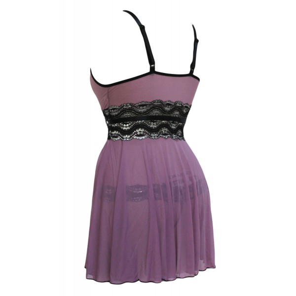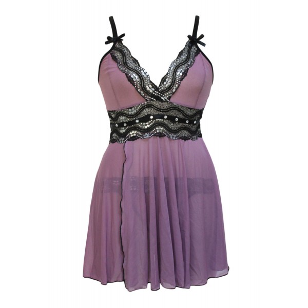 Babydoll lilac mesh and lace metal consisting of two parts, with padded cups and trim at the waist with rhinestones. Babydoll features adjustable straps with bows and asymmetrical slit skirt. Includes matching g-string. |