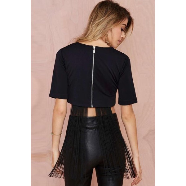 Sexy chic top in black, half sleeves, round neckline and is decorated with long fringe around the hem, smooth zipper on the back. Half sleeve Crop top with fringe is a stylish piece to fit like leggings and sweatpants. Make a fashion statement without try |