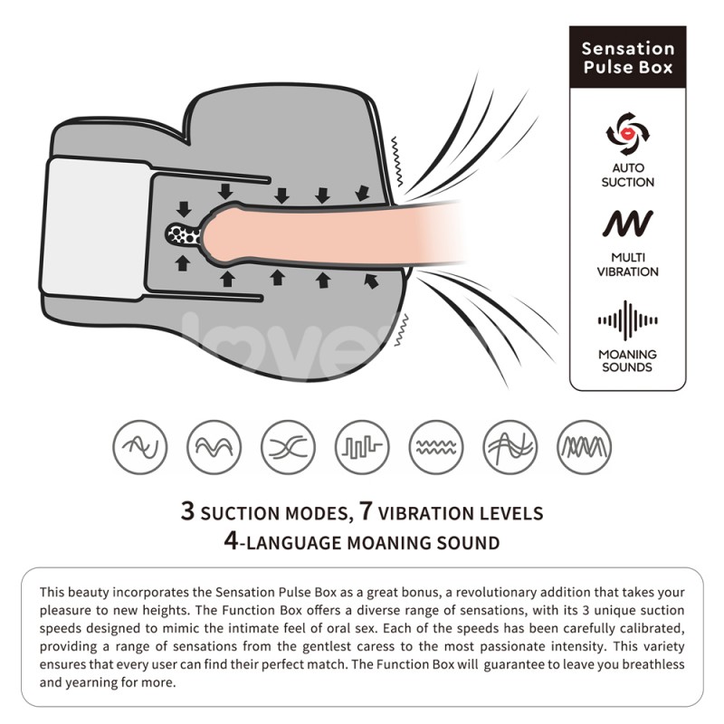 This beauty incorporates the Sensation Pulse Box as a great bonus, a revolutionary addition that takes your pleasure to new heights. The Function Box offers a diverse range of sensations, with its 3 unique suction speeds designed to mimic the intimate feel of oral sex. Each of the speeds has been carefully calibrated, providing a range of sensations from the gentlest caress to the most passionate intensity. This variety ensures that every user can find their perfect match. The Function Box will guarantee to leave you breathless and yearning for more. With the integration of realistic moaning sounds and 7 vibration frequencies, this Sensation Pulse Box go even further to ensure a truly mind-blowing experience, evoking irresistible pleasure with every skin-friendly experience. Cleaning this luxurious pleasure device is a breeze; Please make sure to remove the sensation box before cleaning, then simply flush the channel with running water and wipe it dry. For optimal enjoyment, we recommend using plenty of lubrication to ensure effortless entry with each use. Key Features: Crafted with body-safe TPE for a lifelike experience. Non-sticky, odorless material with a natural skin color. Includes the seductive Boudoir Thong, USB cable included for charging. On a whole new level with the groundbreaking Sensation Pulse Box. 3 suction modes, 7 vibration levels, 4-language moaning sound. Perfect for both daytime and nighttime indulgence. Size: 7.7 x 7.8 x 5.5 (19.7x20x14cm). Net weight for Masturbator: 5.56 lb (2.52kg). Material: ABS, Body-safe TPE. How to use Sensation Pulse Box? Charge before use. Indicator light blinks during charging and stays on when full. Charging takes 1.5 hours. Hold the POWER/SUCTION button for 2 seconds to turn on/off. Press repeatedly to cycle through 3 suction modes. Hold the VIBRATION button for 2 seconds to start vibration mode. Press repeatedly to cycle through 7 vibration levels. Hold the SOUND button for 2 seconds to start voice mode. Press repeatedly to cycle between Chinese, Japanese, English, and Korean. Compatible with headphones for a discreet and comfortable experience. USB cable charging: 60-90 minutes charge for 60-90 minutes usage. Make sure that you remove the sensation box gently before each cleaning. | |