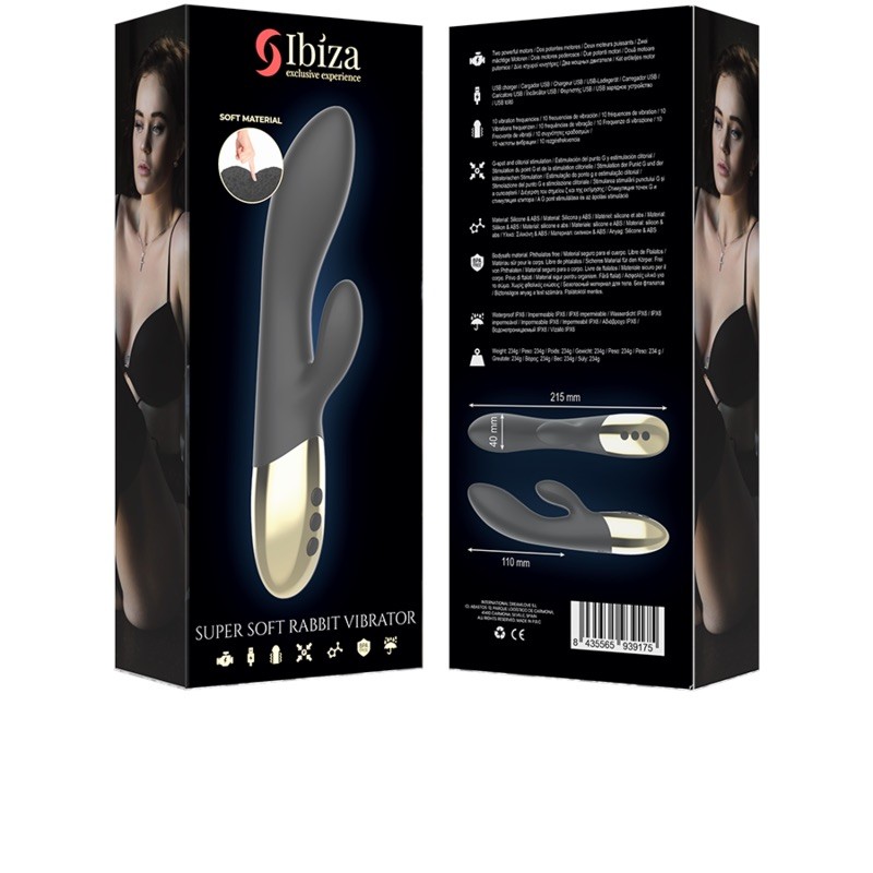 Its time to take sex anywhere! The critically praised rabbit vibrator just got better! Made with the softest, most body-safe silicone in stunning fusion colors of black and gold., Ibiza SUPERSOFT rabbit vibrator is the perfect double action massager that will allow you to achieve a satisfactory result. The option of simultaneous stimulation of the G-spot and the clitoris allows you to enjoy powerful stimulation and release all your pent up inhibitions.