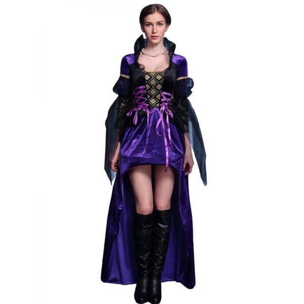 The Wicked Queen costume includes a purple velvet dress with dramatic, high/low hemline, attached black and gold brocade print bodice with lace-up detail, long mesh sleeves, mesh collar and crown. (Necklace, petticoat and stockings not included.) |