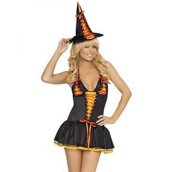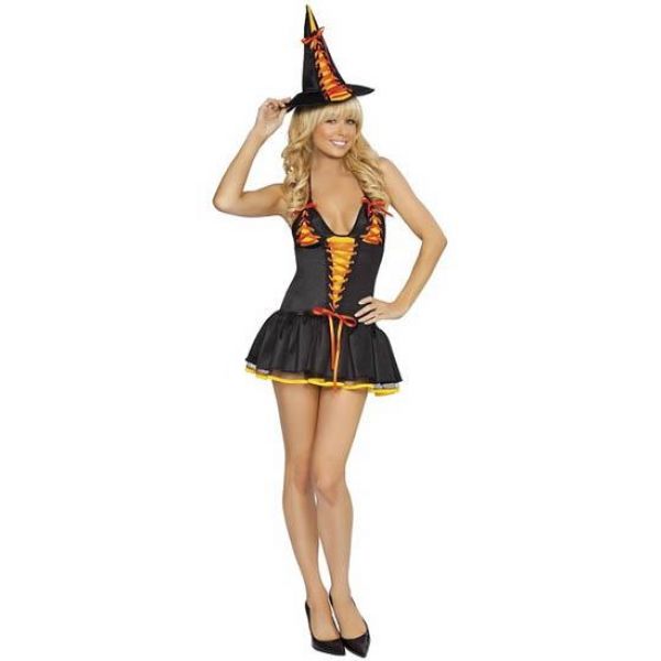 candy witch includes lace-up hat, dress with built-in petticoat & lace-up details.