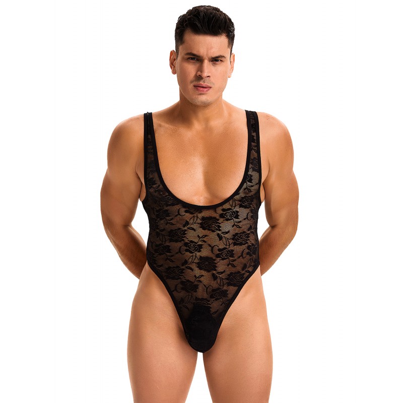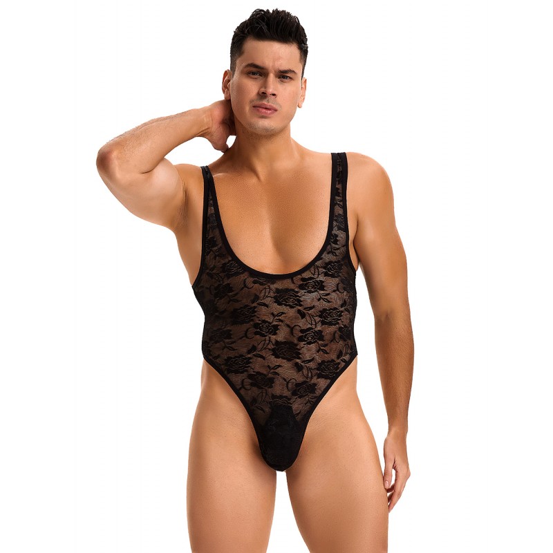 Мужское белье / Черный мужской сексуальный кружевной боди с глубоким вырезом