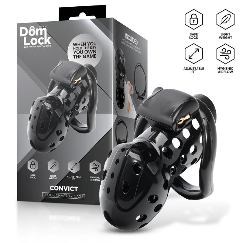 Convict is a black cage that includes four rings of different sizes so you can choose when to use them and enjoy submission in the safest way possible. It also includes one locking piece and five single-use plastic padlocks.