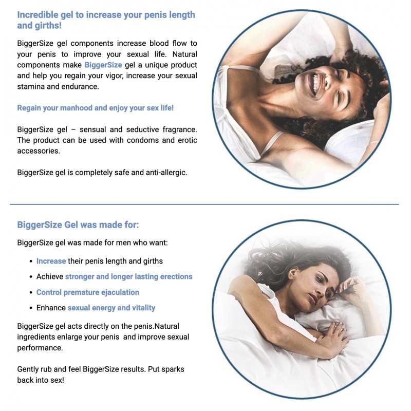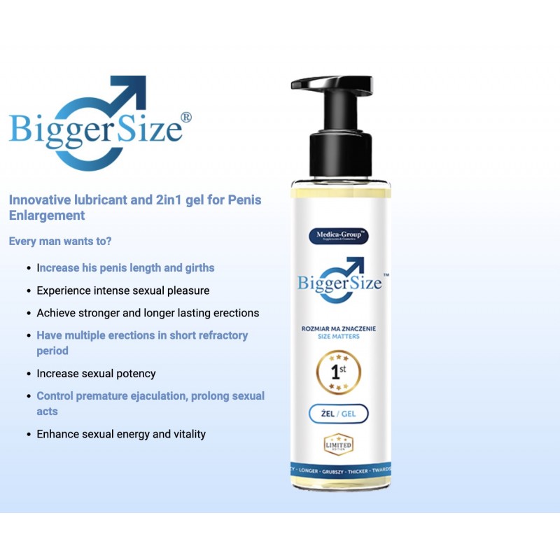 Невероятный гель для увеличения длины и обхвата пениса! Компоненты геля BiggerSize увеличивают приток крови к пенису, улучшая вашу сексуальную жизнь. Натуральные компоненты делают гель BiggerSize уникальным продуктом и помогают восстановить силы, повысить сексуальную выносливость и выносливость. Верните себе мужественность и наслаждайтесь сексуальной жизнью! Гель BiggerSize – чувственный и соблазнительный аромат. Изделие можно использовать с презервативами и эротическими аксессуарами. Гель BiggerSize полностью безопасен и не вызывает аллергии.