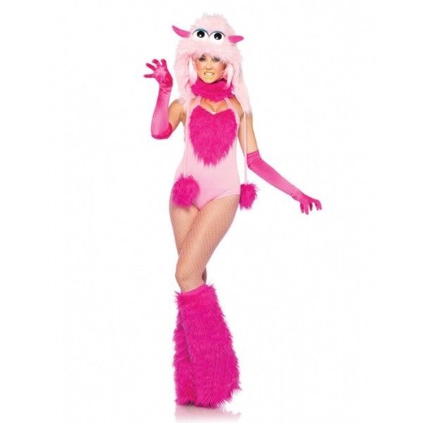 Карнавальный костюм розового цвета включает в себя облегающее боди без бретель, гетры, перчатки, шарфик и шапочку.