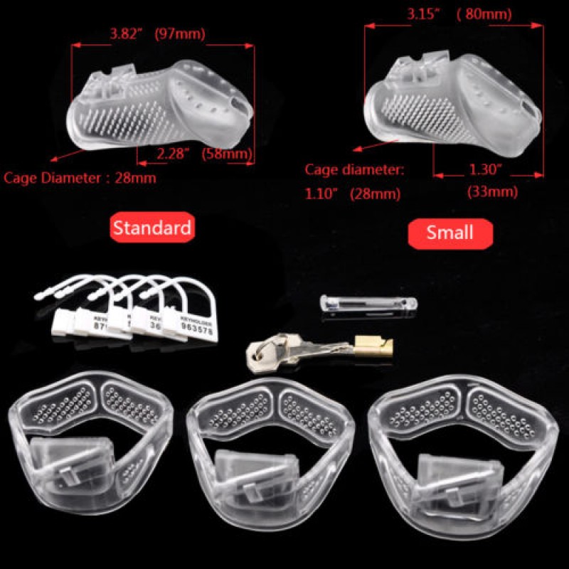 The whole set comes in an discreet package with 1 cage, 3 rings, 1 brass built-in lock (with keys), 5 plastic locks, 1 pin, 1 Zipper bag.