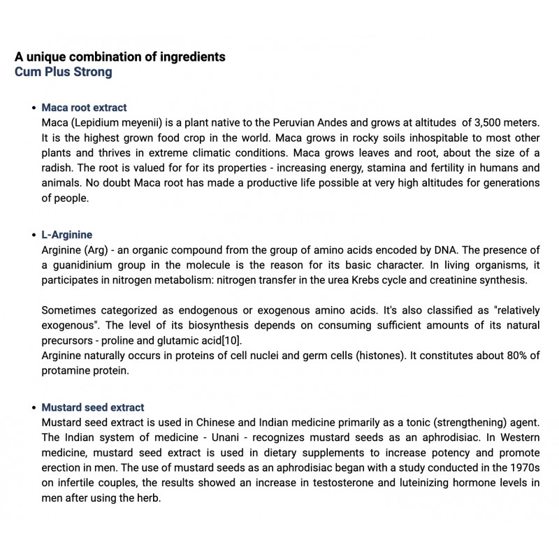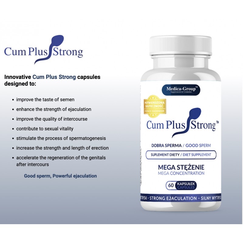 Химический состав спермы в определенной степени зависит от питания. Эякуляция (eiaculatio – эякуляция) – эякуляция семени (спермы), выброс сперматозоидов и семенной плазмы из мужской половой системы. Эякуляция – физиологический процесс, строго контролируемый вегетативной нервной системой. Сперма представляет собой жидкость, которая выделяется из полового члена во время эякуляции. Механизм, обеспечивающий эякуляцию, заключается в ритмическом сокращении кавернозных тел, расположенных в половом члене, так что сперма выбрасывается из репродуктивного органа за пределы тела. Жесткая эрекция. - Мощный оргазм? Активные вещества Cum Plus Strong предназначены для расширения сосудов, облегчения и увеличения притока крови к половому члену. Половой член может стать более опухшим, чем раньше, и эрекция может длиться намного дольше. Эрекция может стать сильнее и дольше. Благодаря этому раздражители, ощущаемые партнером, более интенсивны и чаще заканчиваются оргазмом. Хорошая сперма? Вкус, запах или консистенция спермы отражают состояние вашего организма, особенности вашего образа жизни, диеты и т. д. Вывод таков – чем вы здоровее, тем лучше ваша сперма. A Чем лучше ваша сперма, тем лучшего орального секса вы можете ожидать, поэтому в ваших интересах сделать вашу сперму максимально вкусной. Хорошей новостью является то, что вам не нужно радикально менять свои привычки, чтобы сделать оральный секс более приятным. для женщин. Вам не нужно тратить целое состояние, чтобы улучшить свое здоровье и самочувствие. Способ применения и дозы: по 1 капсуле 2 раза в день, запивая водой. ВАЖНО - Не принимайте более 2 капсул в день. Каждая упаковка Cum Plus Strong содержит 60 капсул, т.е. 30 суточных доз. Препараты для потенции используются для лечения эректильной дисфункции (ЭД) - состояния, при котором мужчина испытывает проблемы с достижением или поддержанием эрекции, достаточной для совершения сексуального акта. ЭД может быть вызвана различными факторами, включая физические, психологические или комбинированные причины. Препараты для потенции могут быть полезны для мужчин, у которых эректильная дисфункция причиняет дискомфорт и препятствует выполнению сексуальной активности. Однако следует отметить, что препараты для потенции не являются лечением причины ЭД, а лишь временно устраняют симптомы. Поэтому важно проконсультироваться с врачом, чтобы выявить причины эректильной дисфункции и назначить оптимальное лечение, включая изменения образа жизни, психотерапию или другие медицинские методы. «Медика-Групп» работает на рынке пищевых добавок и парфюмерии с 1999 года. За это время наша компания завоевала доверие и уважение клиентов благодаря высокому качеству и эффективности продукции. Мы стремимся соответствовать всем требованиям Европейского Союза, что подтверждает наш высокий уровень производства и контроля качества. Наша продукция, включая пищевые добавки и косметику, содержит экстракты с уникальными свойствами. Мы тщательно отбираем ингредиенты, уделяя особое внимание их натуральности и безопасности для здоровья. Именно благодаря этому наши продукты обладают исключительной эффективностью и полезными свойствами. Одним из ключевых преимуществ нашей компании является использование исключительно высококачественного сырья. Мы уверены, что только наилучши