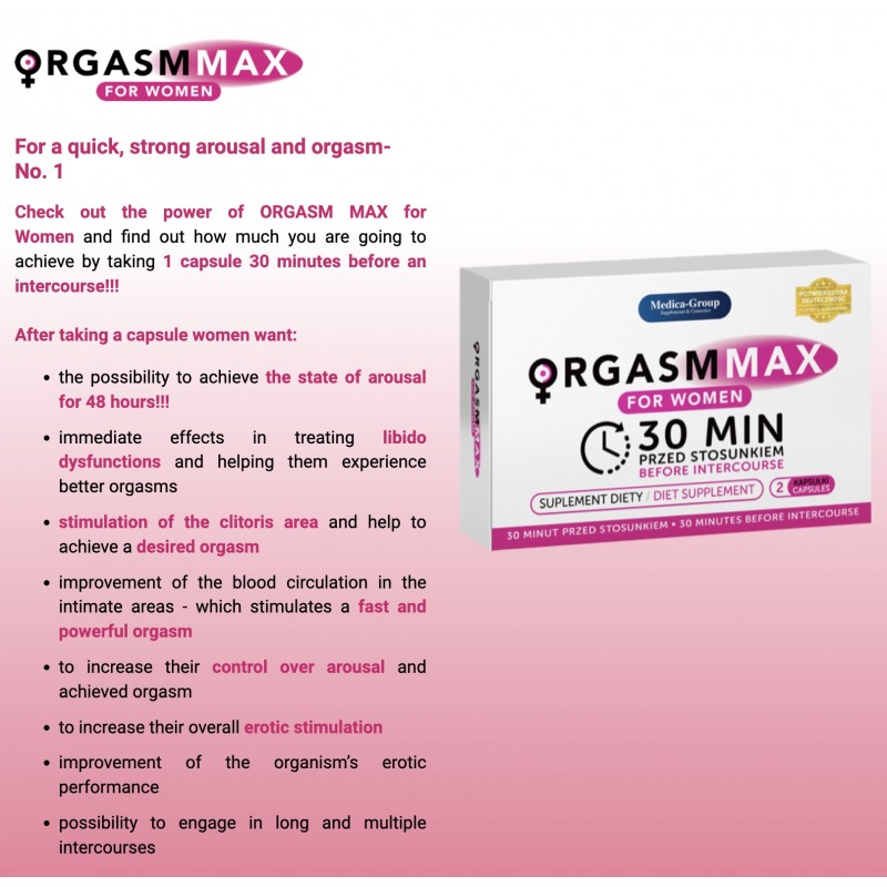 Для быстрого, сильного возбуждения и оргазма - №1. Оцените силу ORGASM MAX для женщин и узнайте, чего вы добьетесь, приняв 1 капсулу за 30 минут до полового акта! После приема капсул женщины хотят: возможность достичь состояния возбуждения на 48 часов; немедленный эффект в лечении дисфункций либидо и помогает им испытать лучшие оргазмы; стимуляция области клитора и помощь в достижении желаемого оргазма; улучшение кровообращения в интимных зонах – что способствует быстрому и мощному оргазму; повысить их контроль над возбуждением и достигнутым оргазмом; увеличить их общую эротическую стимуляцию; улучшение эротической активности организма; возможность участвовать в длительных и многократных половых актах.