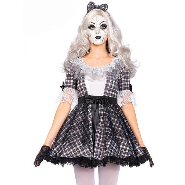 Leg Avenue 85511 Pretty Porcelain Doll Costume. Delightfully creepy 3 piece evil doll costume includes a black and white gothic dress with lace trim and bow accents, matching bow headband and sinister face mask. We recommend adding a black petticoat skirt to achieve the look pictured.