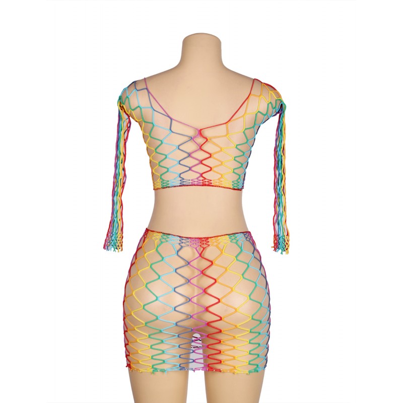 Радужный цветной сетчатый боди с длинным рукавом из двух частей - это прекрасный выбор, который сочетает в себе элегантность и сексапильность. Исполненный в ярких и насыщенных цветах, он привлекает внимание и создает нарядный образ для любого случая.