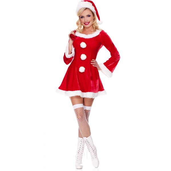 A red long sleeve a line dress with white fur trim and white pom pom accents. It also includes a Santa sack and Santa hat. Stockings not included.
