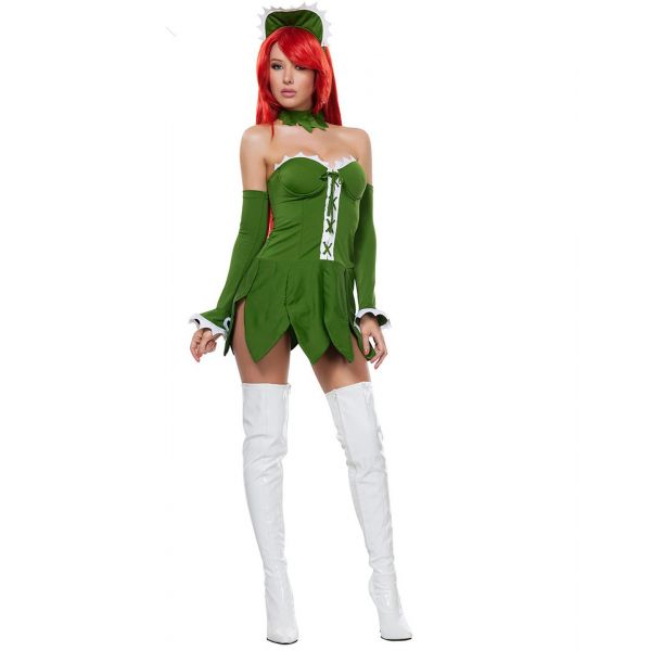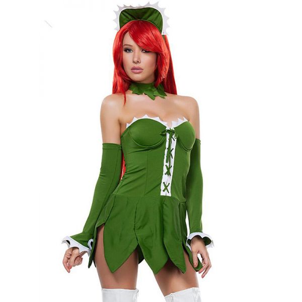 hunt for studly prey with this limited edition yandy venus fly trap costume that includes a corset style dress with a jagged skirt, scalloped trimming at the bust and on the glovelettes, faux lace up detail in front with a zip up backside, and choker with hat. (boots not included.)